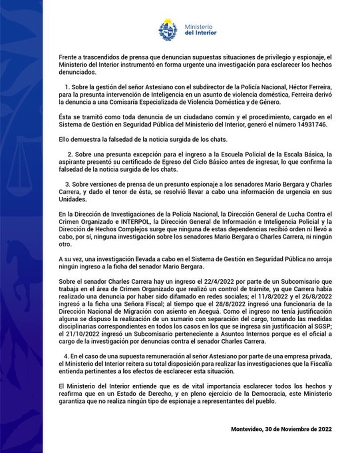 “Ninguna de estas dependencias recibió orden ni llevó a cabo, por sí, ninguna investigación sobre los senadores Mario Bergara o Charles Carrera, ni ningún otro”, afirma el comunicado.