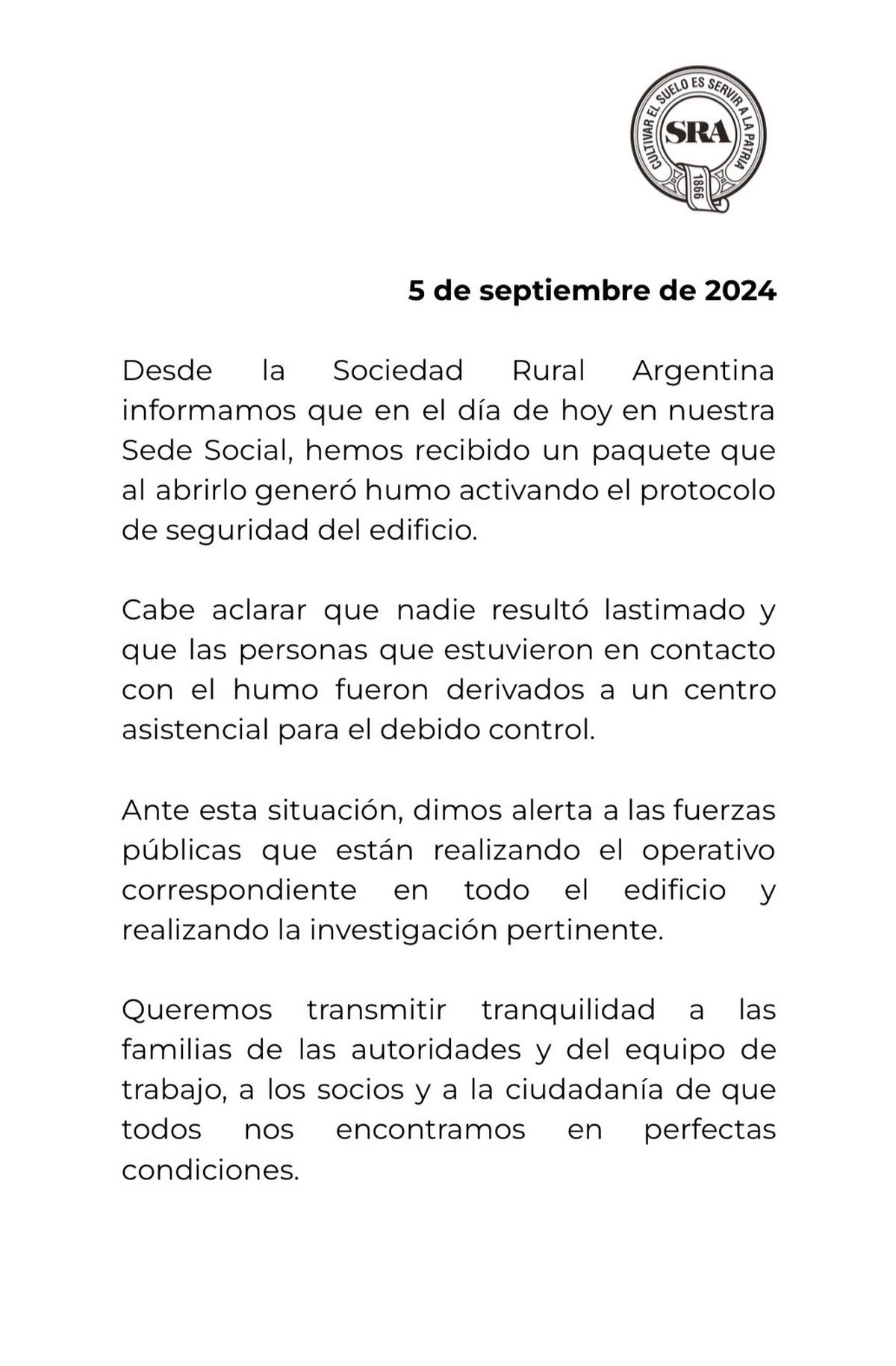 La Sociedad Rural Argentina publicó pasado el mediodía un comunicado: