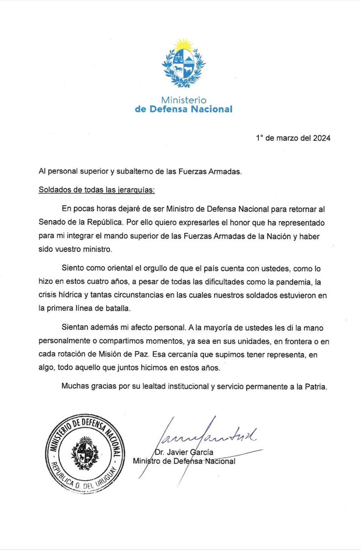 El ministro de Defensa Javier García se despidió del cargo con una carta publicada en redes sociales que dirigió “al personal superior y subalterno de las Fuerzas Armadas” (FFAA).