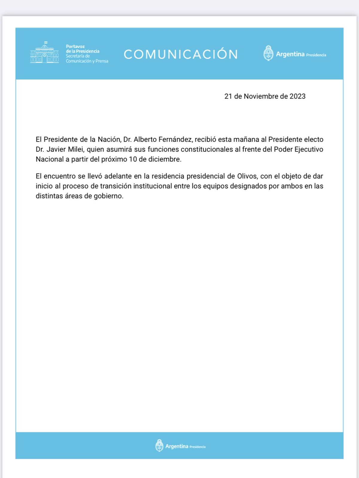 El gobierno argentino emitió un comunicado sobre las 9:25 horas, indicando el fin del encuentro. "El encuentro se llevó adelante (...) con el objeto de dar inicio al proceso de transición institucional entre los equipos designados por ambos en las áreas de gobierno", indicó.