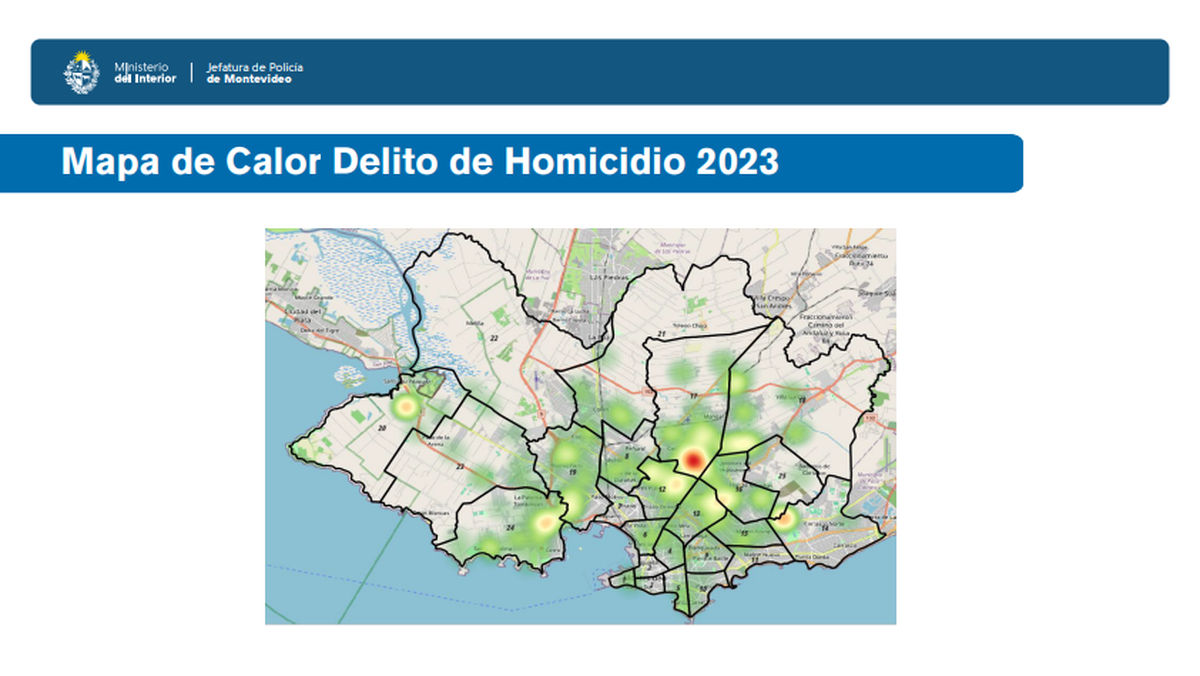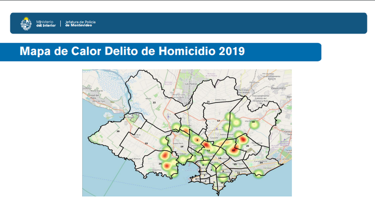 Respecto a los homicidios en 2019, dijo que "los barrios con mayor índice delictivo eran el Cerro, La Teja, Peñarol, Sayago, Casavalle, Villa García y la Flor de Maroñas" y comparó con 2020: "Vemos que esos focos de color rojo empiezan a disminuir en algunos lugares, en otros se transforman en verde y en otros desaparecen. Eso se debe al combate del delito y evidentemente al corrimiento. Empiezan a aparecer en otras jurisdicciones de Montevideo algunos tonos de color verde o amarillo que antes no existían".