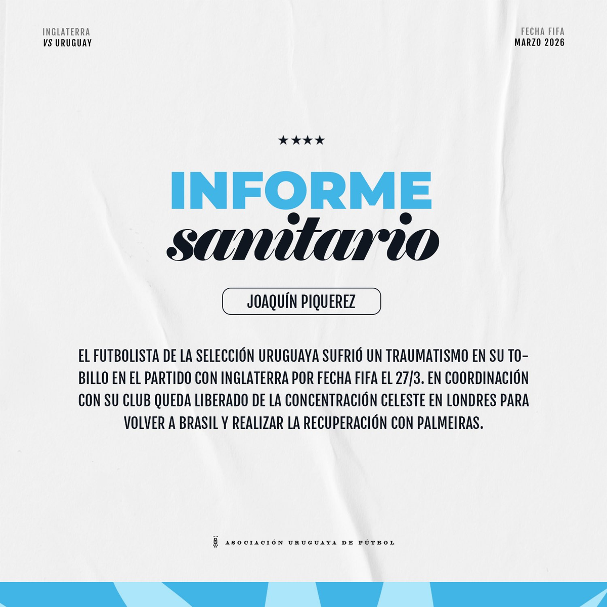 Joaquín Piquerez fue liberado de la selección uruguaya y regresará a Palmeiras para continuar con su recuperación, luego de sufrir un traumatismo en el tobillo derecho durante el partido del viernes ante Inglaterra.