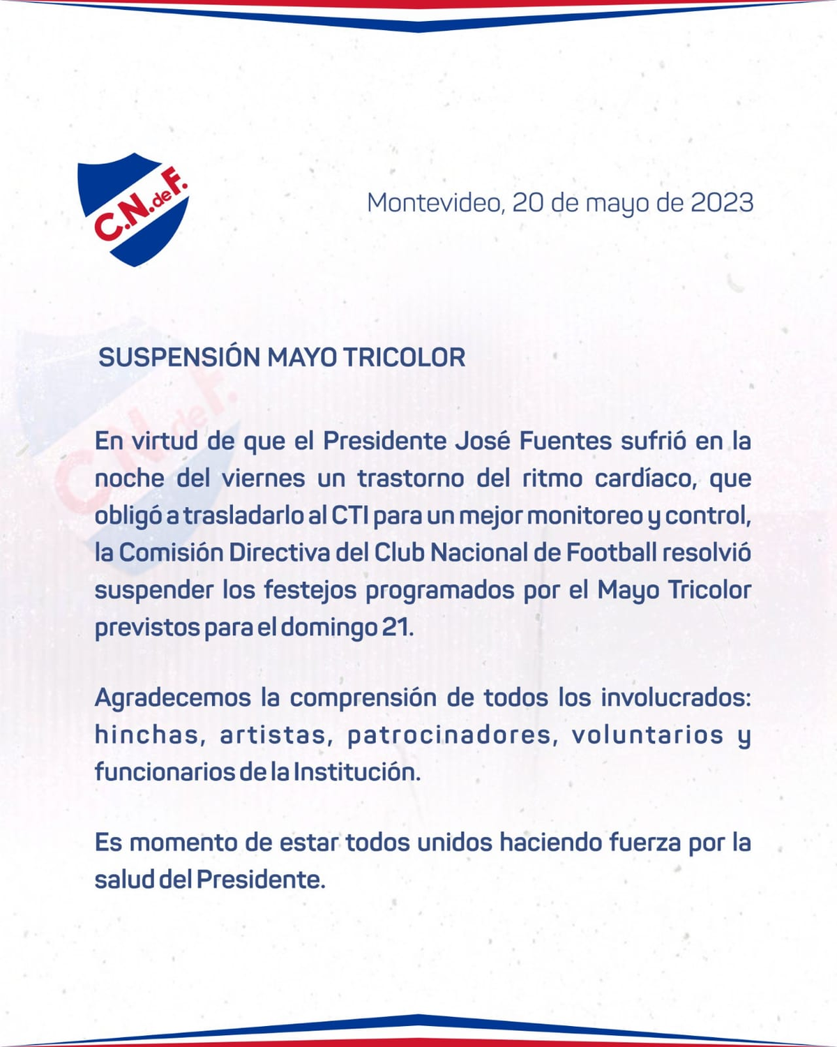 El presidente de Nacional, José Fuentes, sufrió un infarto y fue derivado a CTI. El Club Nacional de Football informó del hecho en sus redes sociales e indicó que se suspenden los festejos de Mayo Tricolor de este domingo.