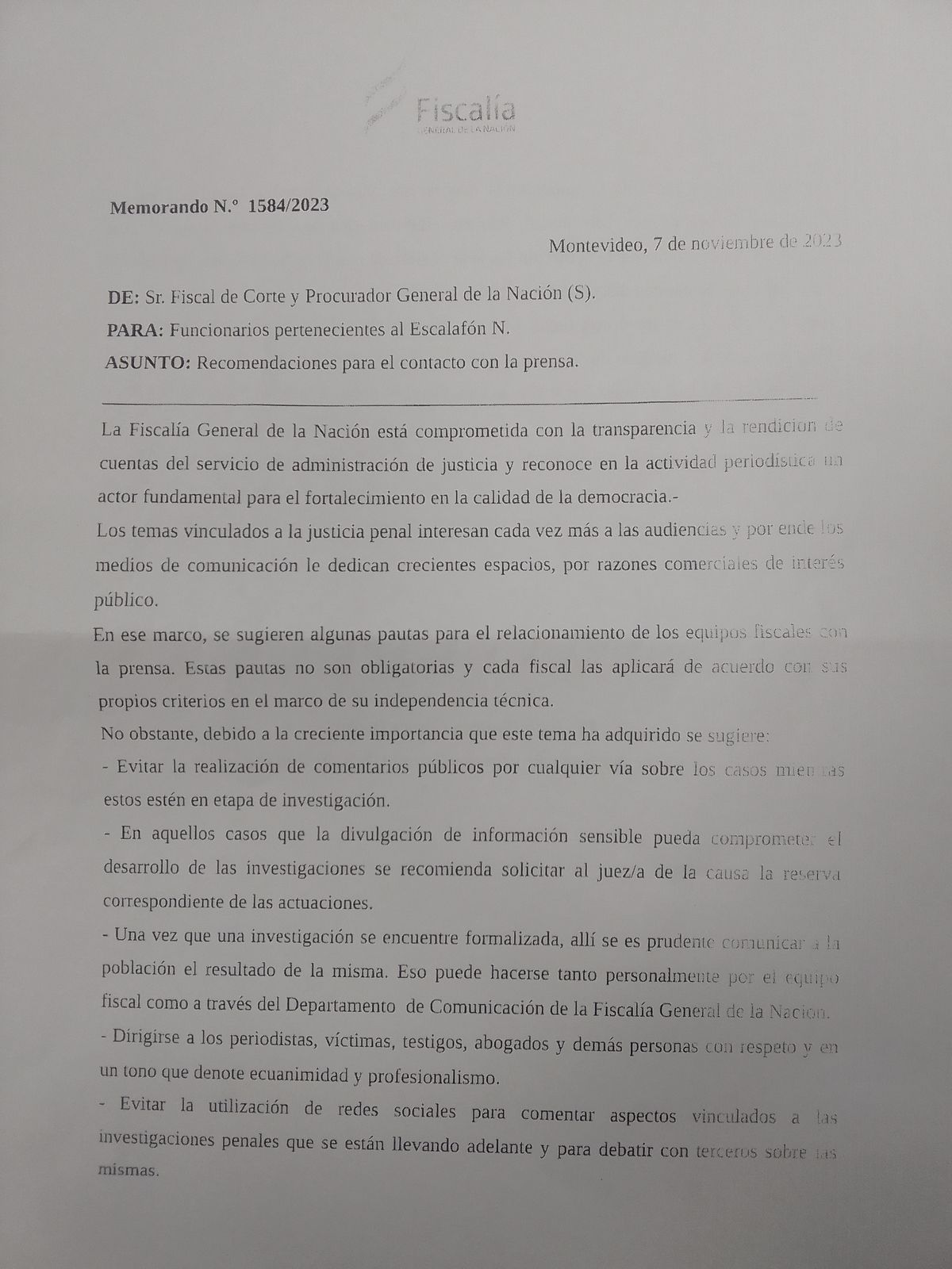 El fiscal de Corte, Juan Gómez, firmó un memorando dirigido a los equipos fiscales en el que establece recomendaciones para el contacto con la prensa y el uso de las redes sociales.