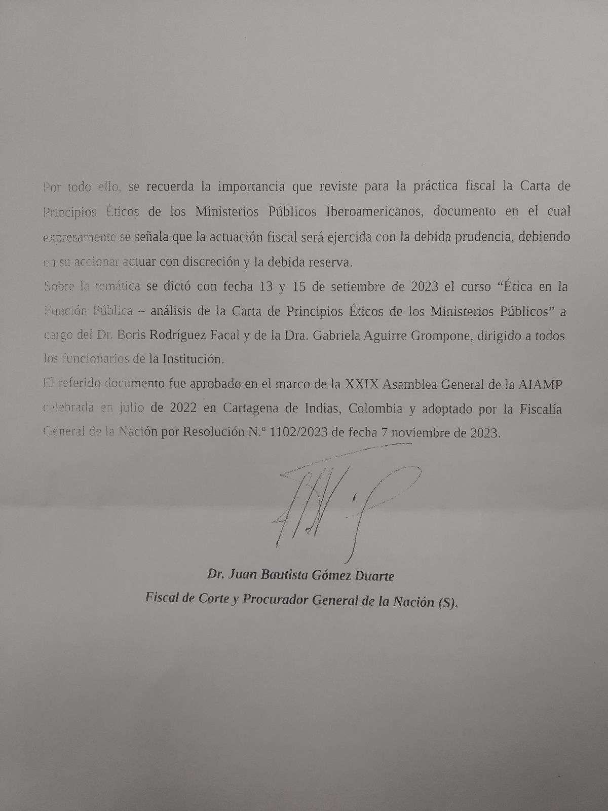 El fiscal de Corte afirma, en base a la Carta de Principios Éticos de los Ministerios Públicos Iberoamericanos, que “la actuación fiscal será ejercida con la debida prudencia, debiendo en su accionar actuar con discreción y la debida reserva”.