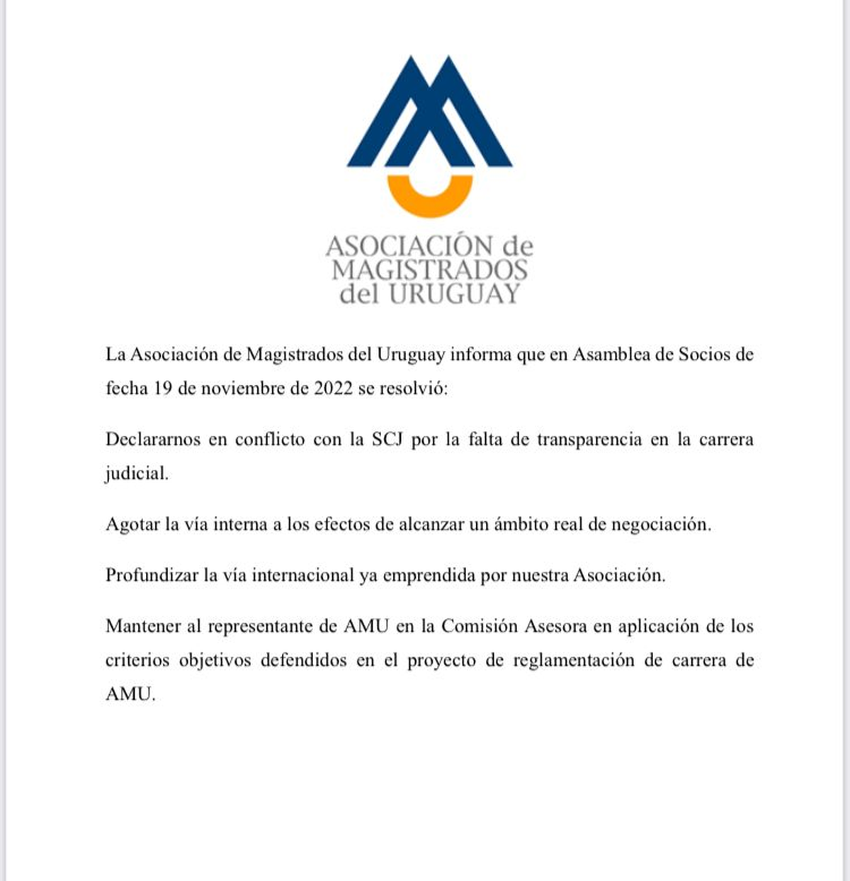 La Asociación de Magistrados del Uruguay se declaró en conflicto con la Suprema Corte de Justicia(SCJ) y reclama "falta de transparencia en la carrera judicial", así como necesidad de diálogo y negociación sobre este punto.