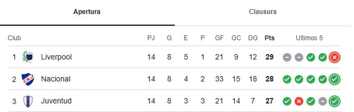 Juventud le ganó a Liverpool 1 a 0 e impidió que ganara el Apertura este fin de semana. Ahora los negriazules lideran con 29 puntos, pero tienen a Nacional con 28, tras la goleada del tricolor sobre Cerro 4 a 0. Y Juventud, que tenía 24 puntos, quedó tercero con 27, y tiene chance de obtener el primer torneo del año.