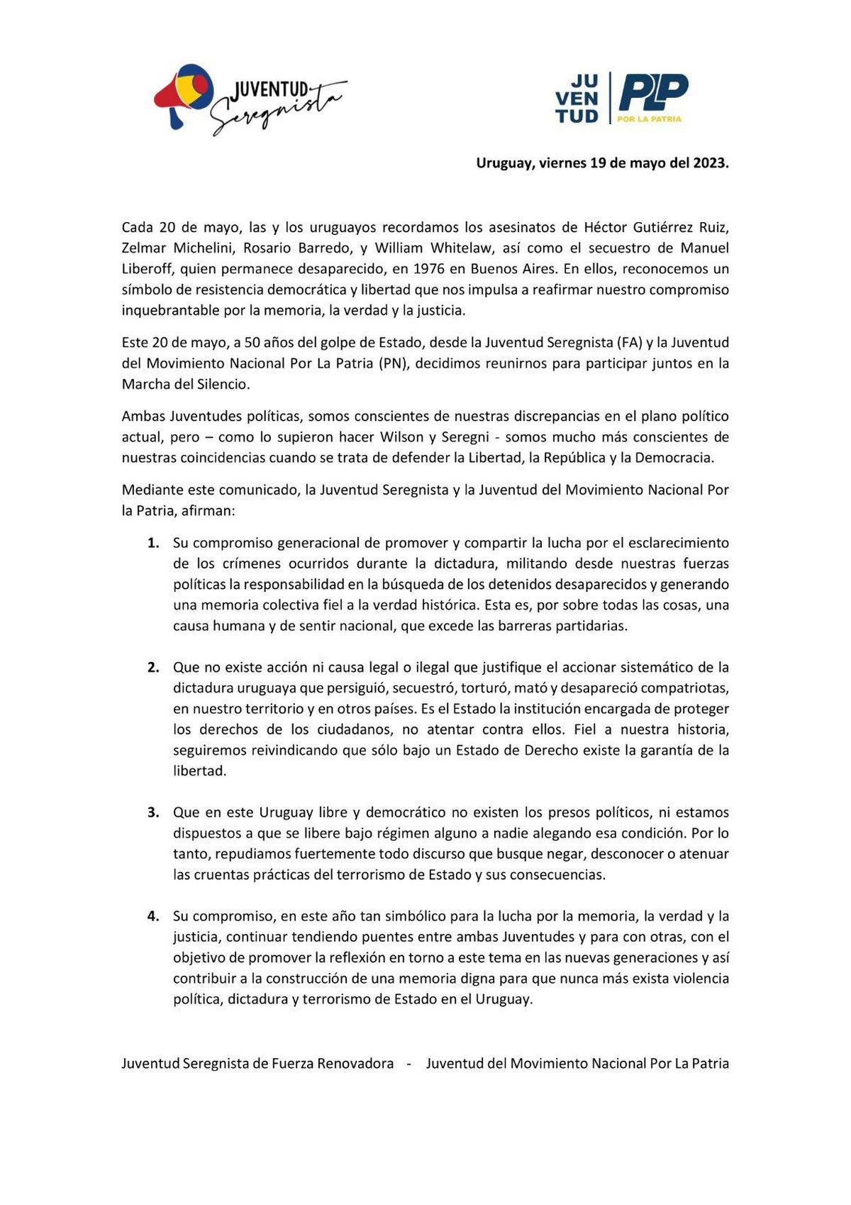 A 50 años del golpe de Estado, la Juventud Seregnista (Frente Amplio) y la Juventud del Movimiento Nacional Por La Patria ( Partido Nacional) emitieron una declaración conjunta por los asesinatos de Héctor Gutiérrez Ruiz, Zelmar Michelini, Rosario Barredo, y William Whitelaw, así como el secuestro de Manuel Liberoff, quien permanece desaparecido.