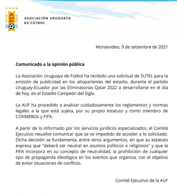 La AUF comunicó este jueves de tarde que si bien recibió una solicitud del sindicato de Antel (Sutel) para emitir publicidad durante el partido de esta noche entre Uruguay y Ecuador por las Eliminatorias para el Mundial de Qatar 2022, se resolvió no hacer lugar a tal pedido.