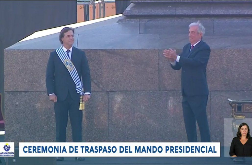 Luego ambos firmaron las actas de traspaso del Mando Presidencial y segundos más tarde Vázquez se sacó la banda presidencial y se la colocó a Lacalle Pou, con lo que se completaron los actos protocolares de este 1º de marzo.