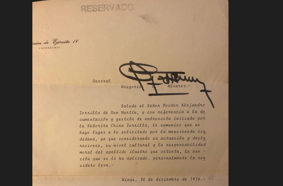 El 30 de diciembre de 1976, el “Goyo” Álvarez respondió con una carta en la que no daba lugar a levantar la proscripción, pero además decía que a su juicio la dictadura había sido suave con “China”.