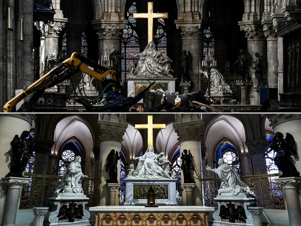 Escombros y la cruz en el altar dentro de la catedral de Notre-Dame en París, un mes después del incendio que la afectó gravemente, el 15 de mayo de 2019 (arriba), y el tabernáculo diseñado por el artista y diseñador francés Guillaume Bardet en el corazón de la catedral de Notre-Dame en París, el 29 de noviembre de 2024.
