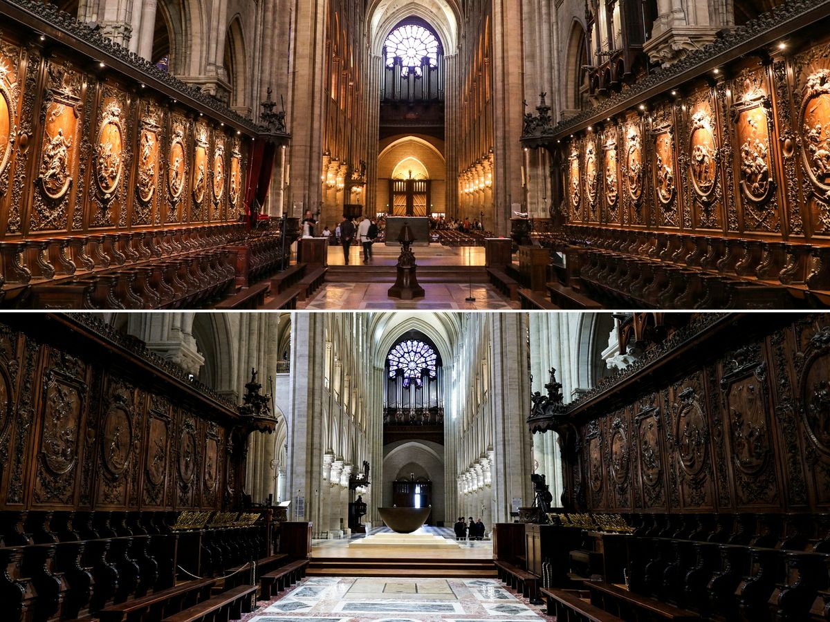 Los asientos del coro de la catedral de Notre-Dame en París el 26 de junio de 2018 (arriba) y el 29 de noviembre de 2024 (abajo).