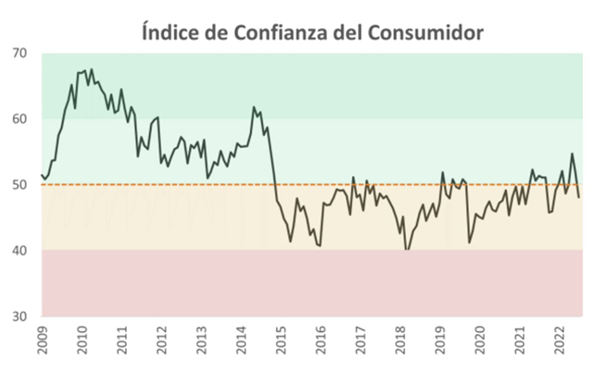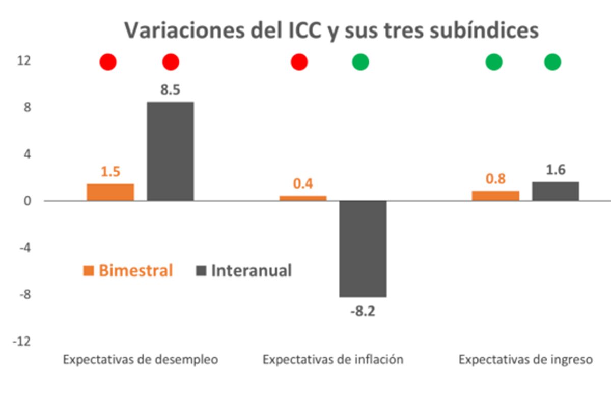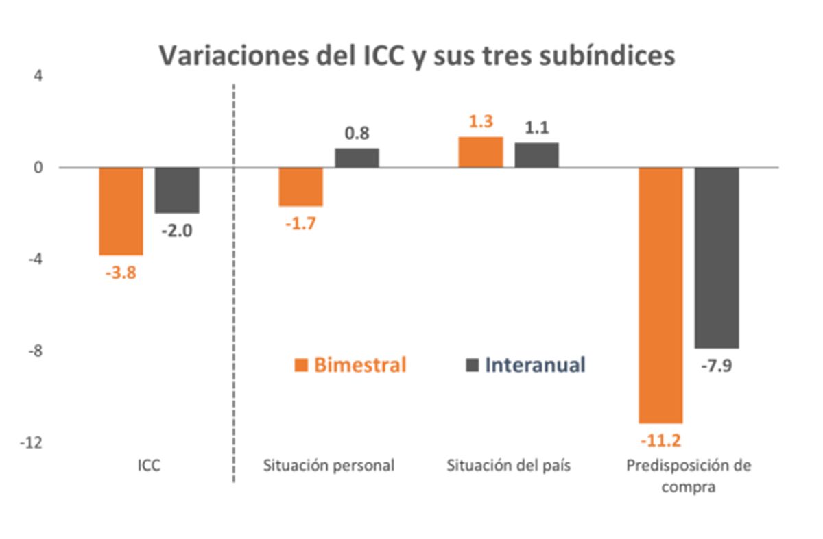 En lo que refiere a la variación bimestral, el deterioro del subíndice responde al menor optimismo de los consumidores en torno a su situación actual, y también a su evaluación sobre la situación futura (12 meses hacia adelante).