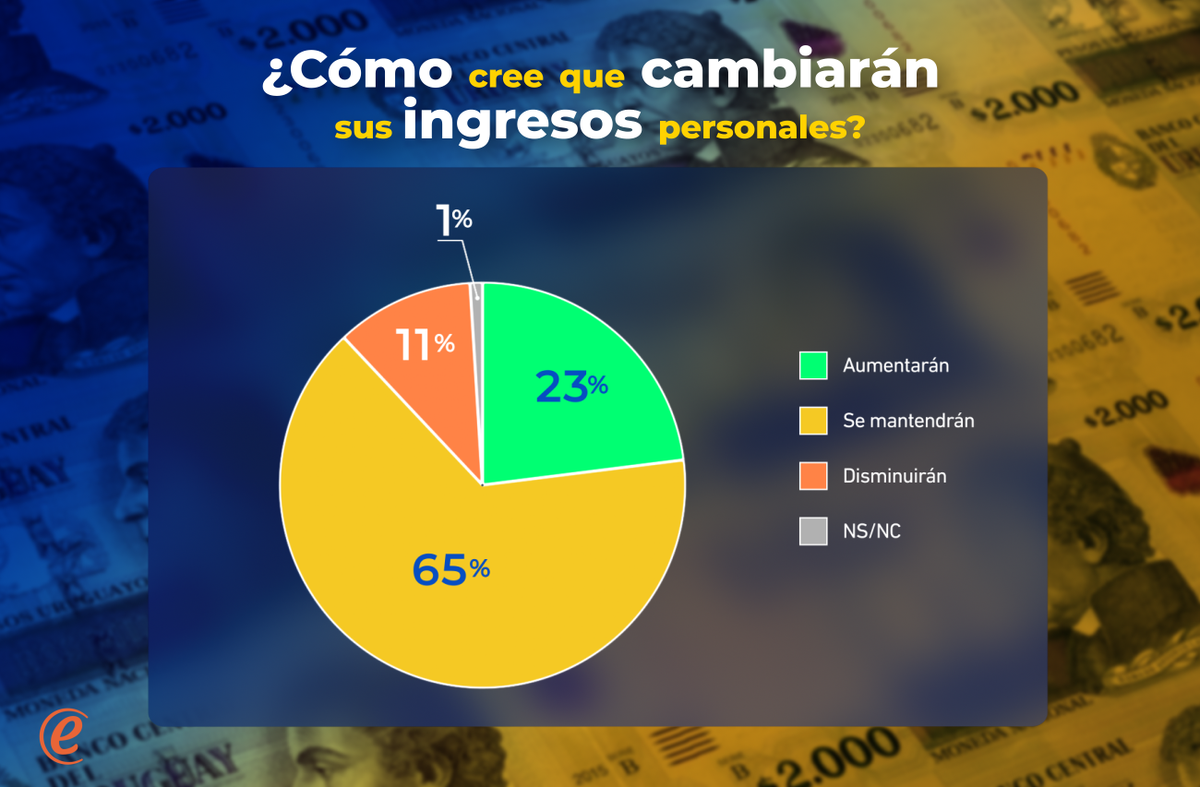 Con relación a cómo evolucionarán los ingresos personales, la mayoría no espera grandes cambios (65%) pero, en este caso, el grupo optimista que considera que sus ingresos aumentarán (23%) supera al grupo pesimista que considera que disminuirán (11%).