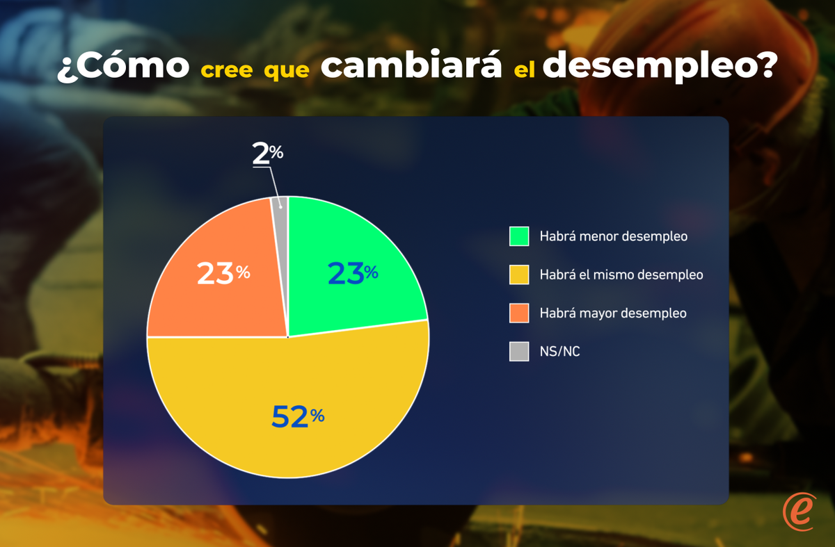 Con relación al mercado de empleo, la mayoría (52%) cree que dentro de un año habrá aproximadamente el mismo nivel de desempleo que ahora. Los que creen que el desempleo bajará (optimistas), y los que creen que aumentará (pesimistas) son grupos idénticos (23%). Por tanto, en esta dimensión, visiones divididas de saldo cero, con una percepción mayoritaria de estabilidad.