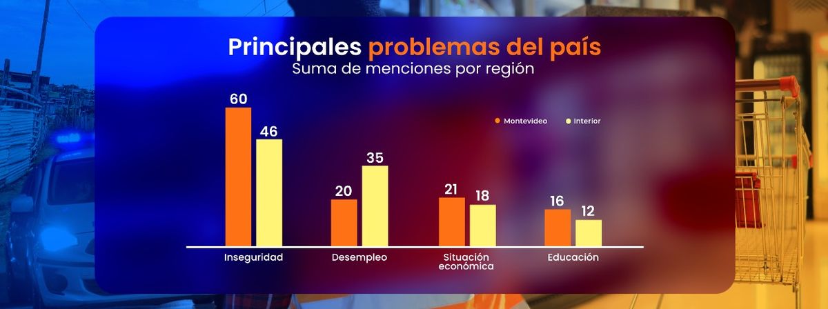Cuando se pregunta a los uruguayos, en forma espontánea, cuál es el principal problema del país, las respuestas son diversas y heterogéneas, pero hay dos elementos que destacan sustantivamente sobre el resto. En primer lugar, la “inseguridad”: más de un tercio (37%) la menciona como el principal problema, y más de la mitad (55%) lo menciona ya sea como primera o segunda respuesta. En un segundo escalón se encuentra el “desempleo”, que recoge un 29% en la suma de menciones. En un tercer plano aparecen referencias a la “situación económica” (19%) y la “educación” (14%), según la última encuesta de Equipos Consultores.