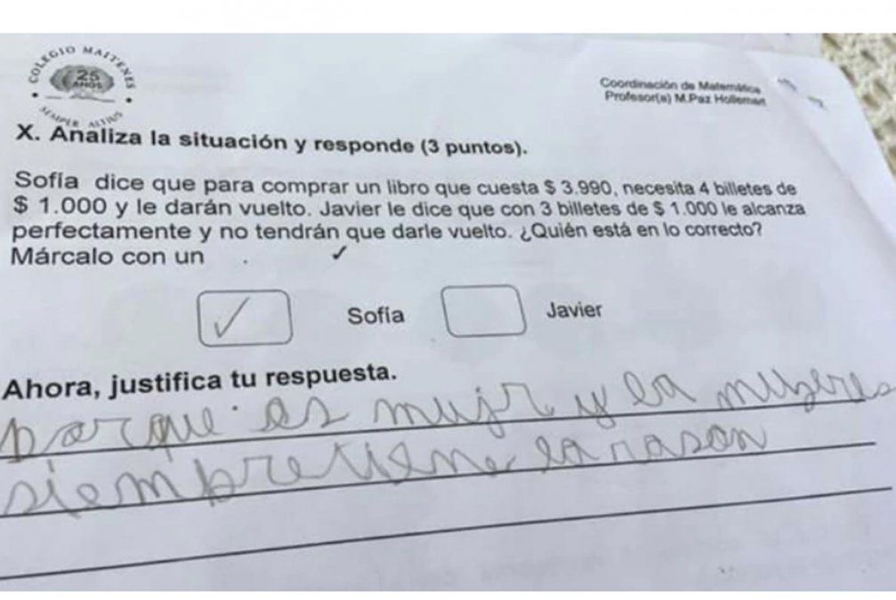 "Sofía dice que para comprar un libro que cuesta $ 3.990 necesita cuatro billetes de $ 1.000 y le darán un vuelto. Javier dice que con tres billetes de $ 1.000 le alcanza perfectamente y no tendrán que darle vuelto", ese era el problema matemático presentado en una prueba en el colegio Maitenes, en la ciudad de Melipilla, a 75 km de Santiago de Chile.