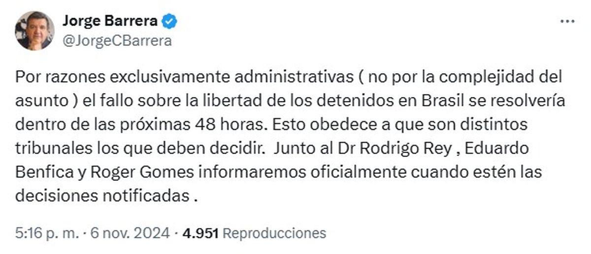 Barrera lo atribuyó a "razones exclusivamente administrativas" y "no por la complejidad del asunto". "Esto obedece a que son distintos tribunales los que deben decidir", aseguró. "Junto al Dr. Rodrigo Rey, Eduardo Benfica y Roger Gomes informaremos oficialmente cuando estén las decisiones notificadas", agregó el letrado.