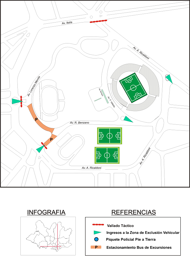 “Aquellos que tengan la categoría A estacionarán frente a la Tribuna América y, quienes posean la tipo B lo harán sobre la Avenida Ramón Benzano, próximo al estadio Parque Luis Méndez Piana”, dice el comunicado del Ministerio del Interior.
