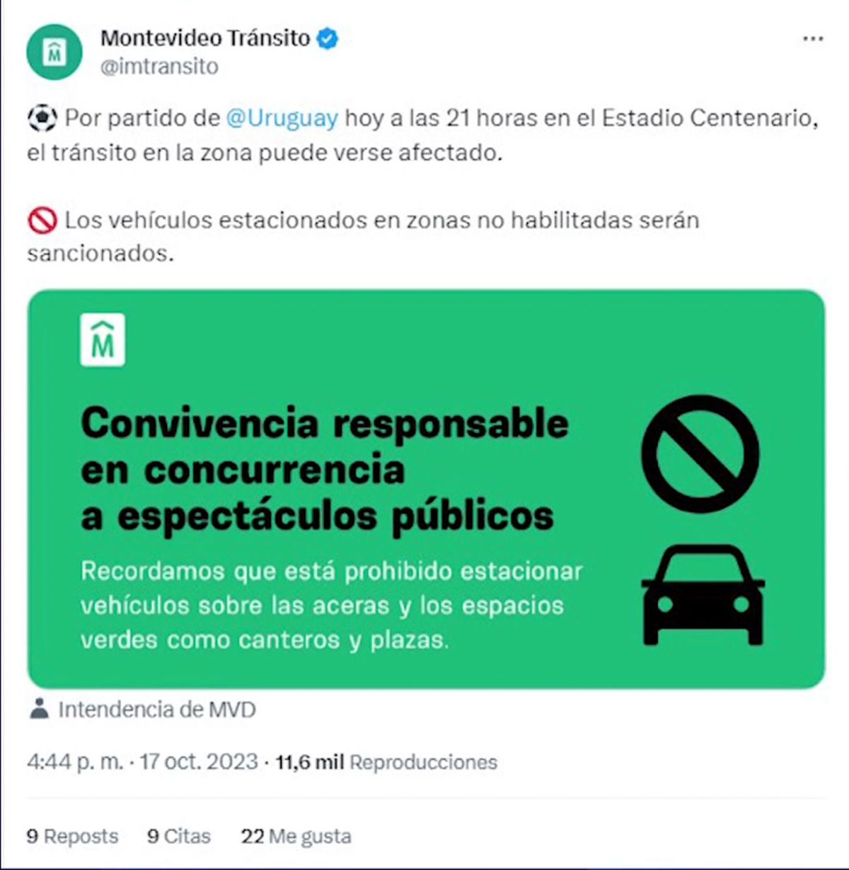 Previo al partido de Uruguay ante Brasil en el Centenario, el martes pasado, la Intendencia de Montevideo recordó por redes sociales la prohibición de estacionar vehículos sobre las aceras y los espacios verdes en los alrededores del estadio.