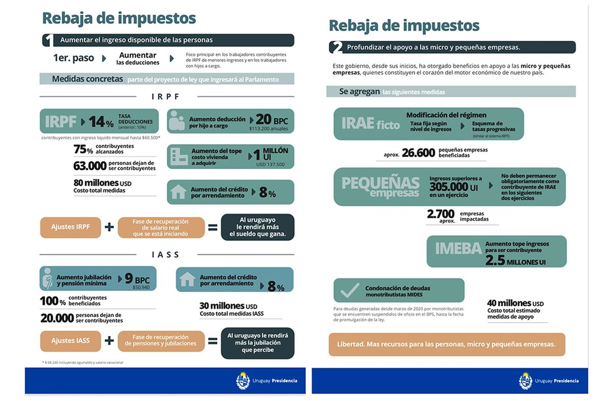"Estamos en condiciones de proceder a una baja de impuestos", dijo el presidente. "Todos sabemos el esfuerzo que realizan estos uruguayos para mantenerse a sí mismos y a sus familias", agregó y remarcó: "El primer paso es aumentar las deducciones con el foco principal en los trabajadores contribuyentes del IRPF de menores ingresos y con los trabajadores que tengan hijos a cargo".