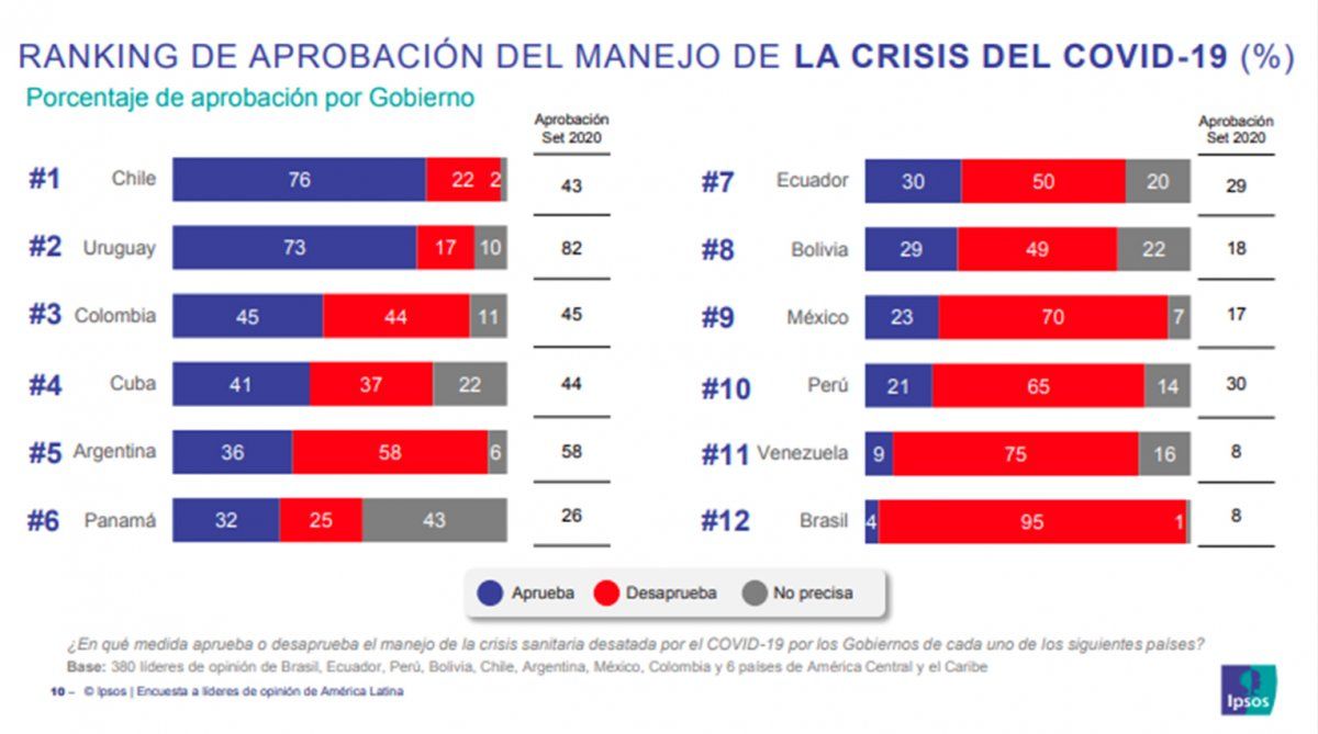 Lacalle Pou es el presidente con mayor aprobación: 68%, y según los líderes de opinión consultados en distintos países, el manejo de la crisis sanitaria que provocó el coronavirus tiene una aprobación del 73%, quedando en segundo lugar detrás del gobierno chileno, que lidera con 76%.