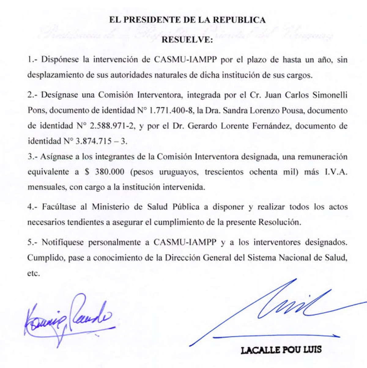 El presidente Lacalle Pou y la ministra de Salud Pública Karina Rando firmaron la resolución que dispone la intervención del Casmu “por el plazo de hasta un año sin desplazamiento de sus autoridades”.