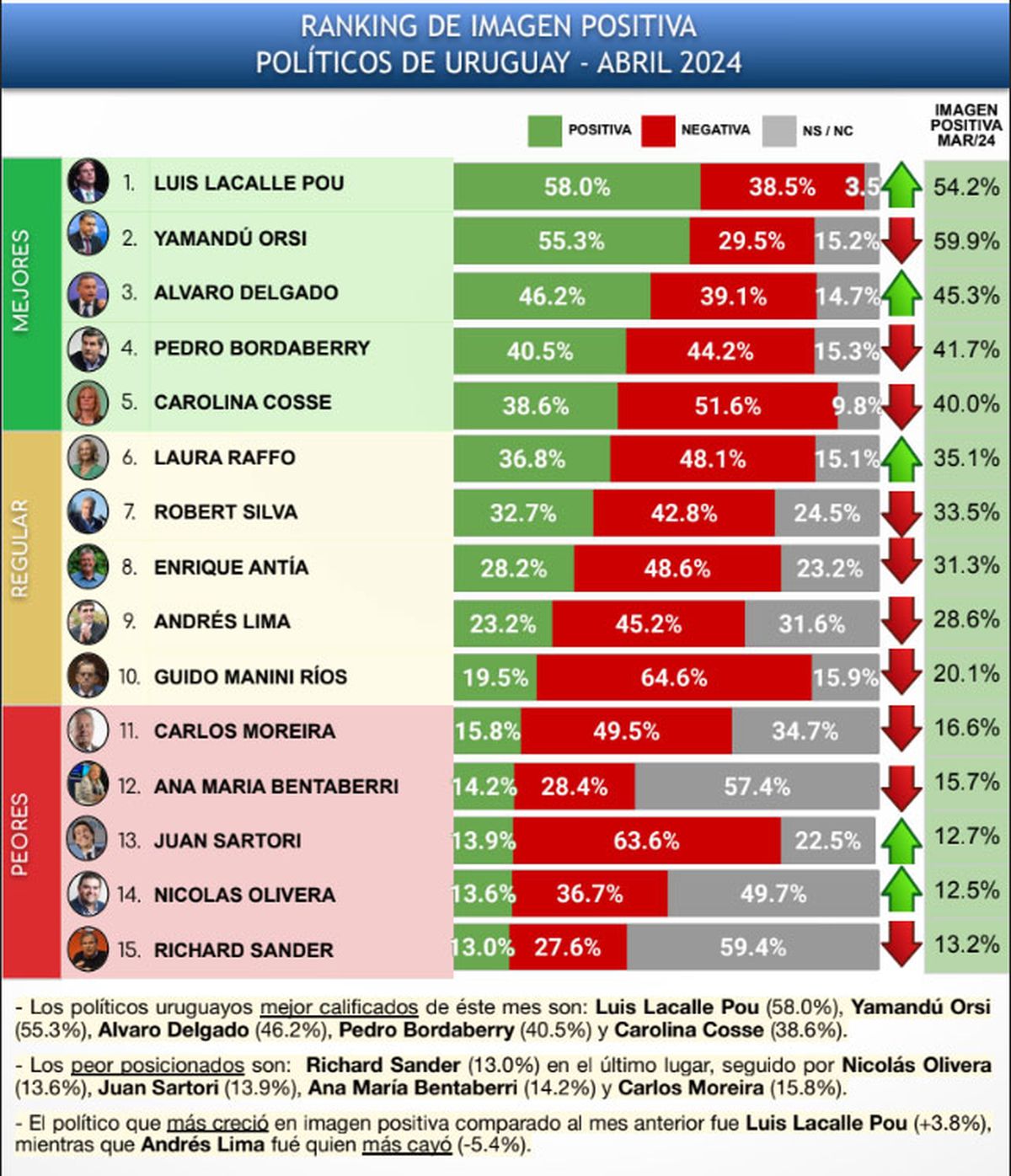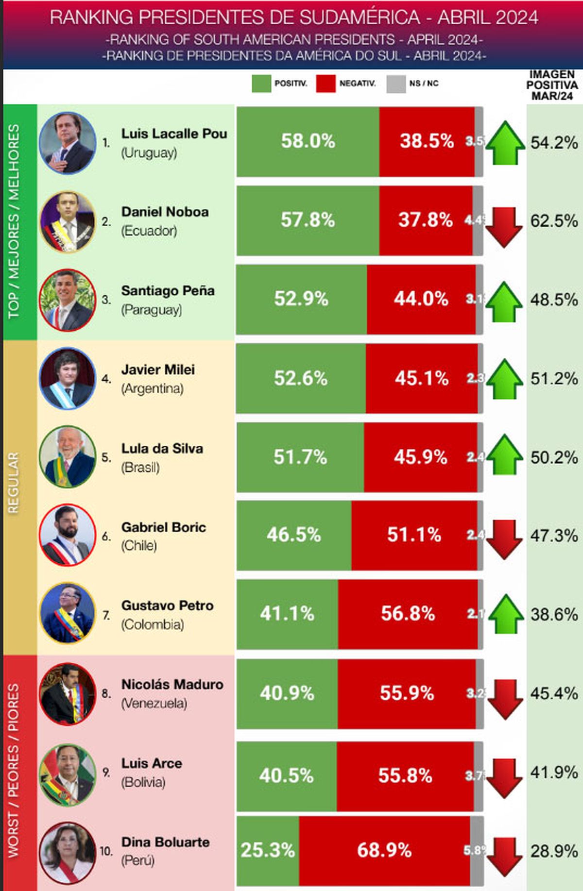 En la medición de abril Lacalle Pou tiene el 58% de opiniones positivas, seguido del presidente de Ecuador Daniel Noboa con 57,8%. El podio lo cierra el presidente de Paraguay Santiago Peña con 52,9%.
