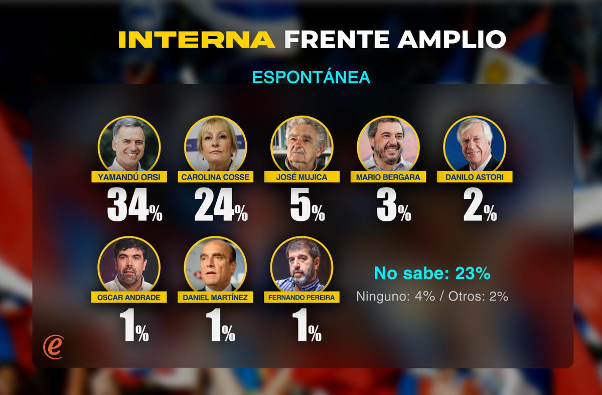 Cuando se pregunta a los frenteamplistas su preferencia en forma espontánea, Yamandú Orsi es el candidato más mencionado (34%), seguido de Carolina Cosse (24%), y bastante más lejos vienen otros candidatos como Mario Bergara (3%), junto con ex candidatos (José Mujica, Danilo Astori, Daniel Martínez) que no estarán en la contienda, y otros actuales líderes que tampoco competirán, (como Óscar Andrade y Fernando Pereira). Hay uno de cada cuatro frenteamplistas que no tiene opinión al respecto (23% no saben, y 4% dice que ninguno), lo que refleja la razonable incertidumbre que una parte del electorado tiene sobre la competencia, faltando todavía un año para la elección.