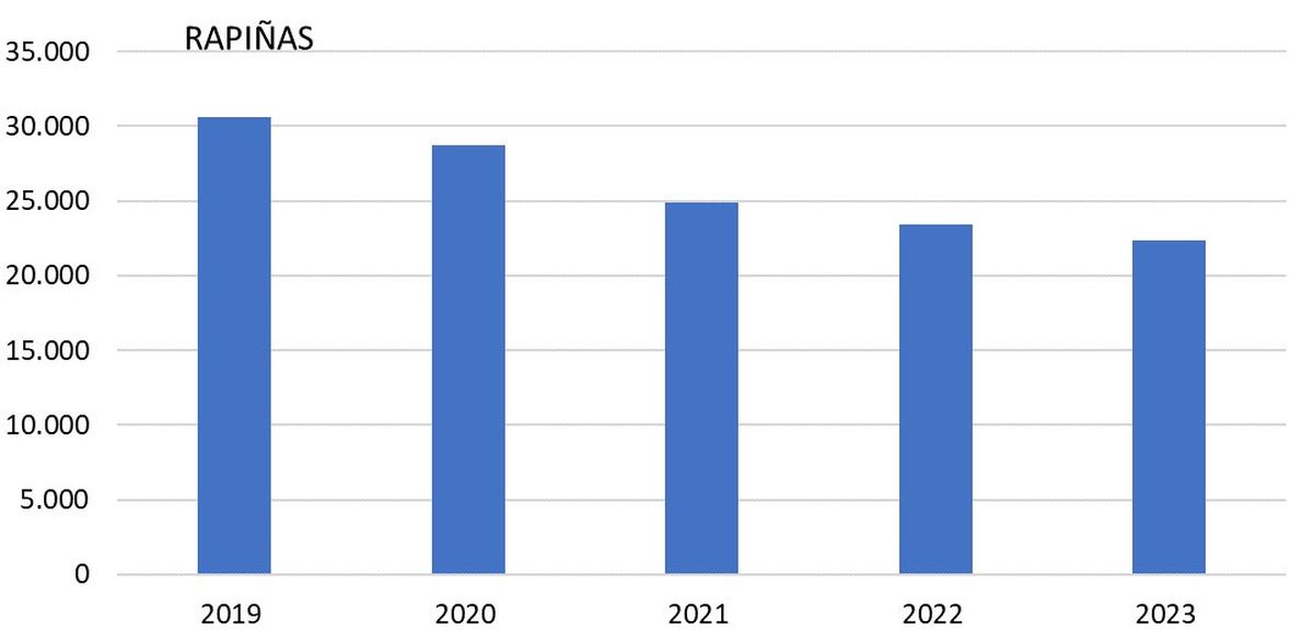 Fueron 22.390 el año pasado, 23.427 en el 2022, se registraron 24.889 en el 2021 y 28.755 en el 2020. De acuerdo a estos datos, en el 2019 hubo 30.638 rapiñas.