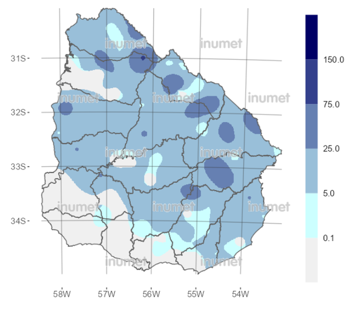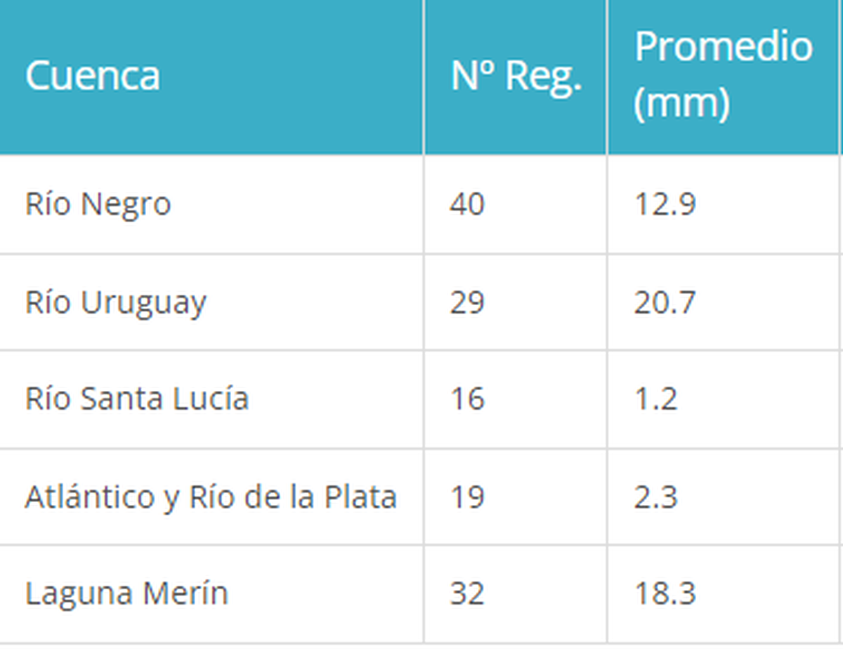 En cuanto a las cuencas, las que más agua recibieron son la del Río Uruguay, con 20,7 mm promedio, y le sigue la de Laguna Merín con 18,3 mm. La que menos recibió fue la de Santa Lucía, con 1,2 mm.