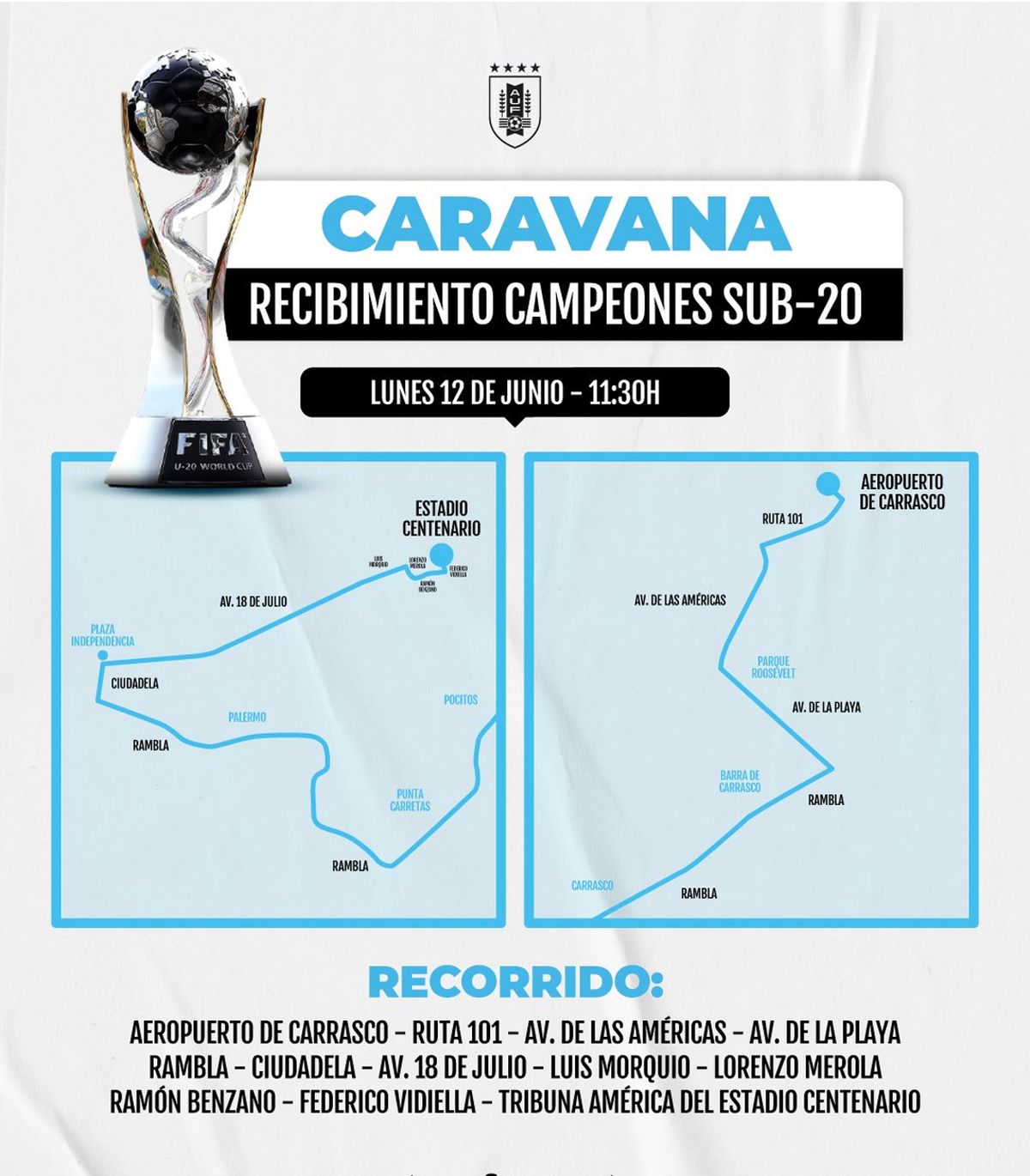 La Selección Uruguaya que se consagró Campeón del Mundo Sub 20 llega este lunes sobre las 11:30 al aeropuerto de Carrasco y de ahí, al mediodía, parte en caravana hasta el estadio Centenario.