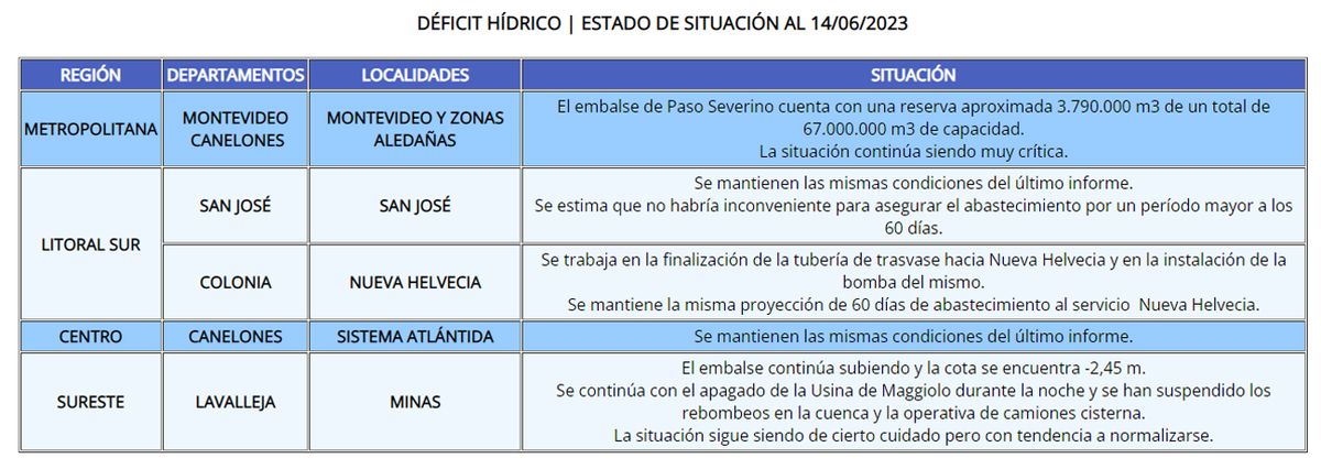 El último informe de OSE indica que las reservas son de 3.790.000 m³, de un total de 67.000.000 m3 de capacidad.
