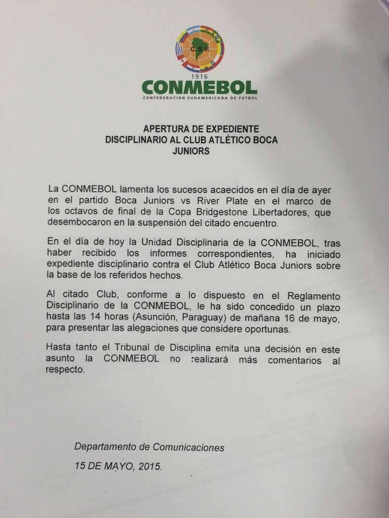 En un comunicado de prensa la Conmebol informó que resolvió darle tiempo a Boca para que presente sus descargos. Tiene plazo hasta la hora 14 de este sábado 16 de mayo.