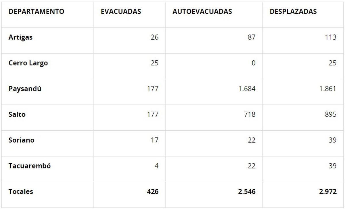 Del total de personas, 426 están en calidad de evacuadas y 2.546 en condición de autoevacuadas, según el último informe del Sinae. 1.861 corresponden a Paysandú, 895 a Salto, 113 a Artigas, 39 a Soriano, 39 a Tacuarembó y 25 a Cerro Largo.