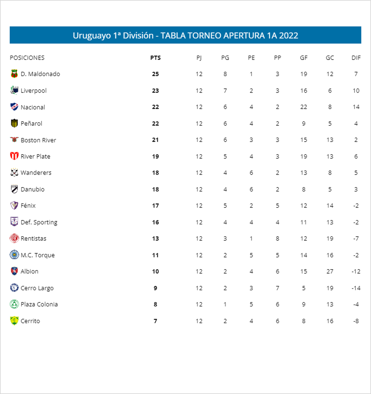 Tras el traspié de Deportivo Maldonado ante Cerro Largo el pasado domingo en el Estadio Mario Ubilla de la ciudad de Melo, el torneo quedó abierto para quienes le siguen de cerca. Liverpool llegó a los 23 puntos, Nacional, Peñarol y Boston River tienen 22 puntos.