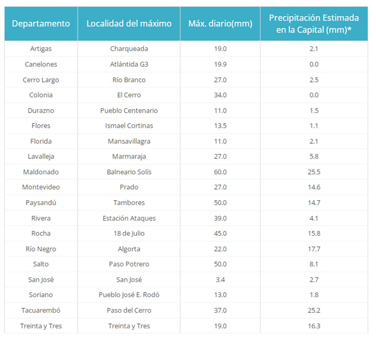 Le siguieron Salto, en Paso Potrero, y Paysandú, en Tambores, ambos con 50 mm. (ver cuadro de registros máximos).