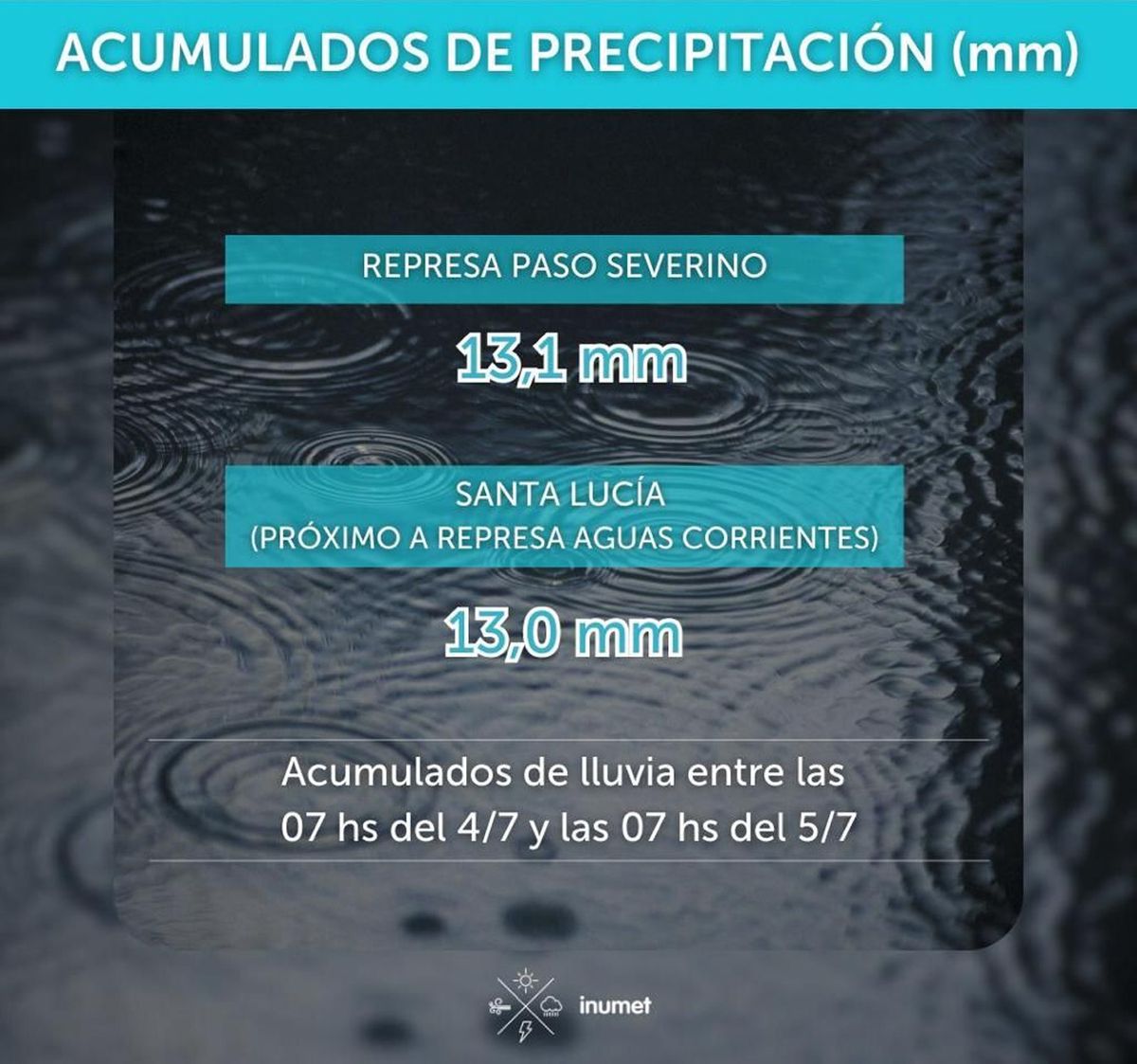 “Sobre la represa de Paso Severino y Aguas Corrientes llovió 13,1 mm y 13,0 mm respectivamente”, agrega el informe oficial.