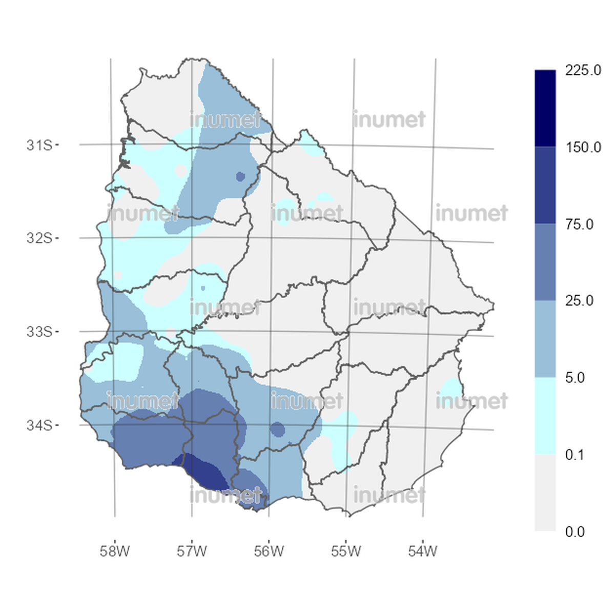 Según el boletín pluviométrico del Instituto Uruguayo de Meteorología (Inumet) las lluvias de las últimas horas se concentraron en el sur y suroeste del país, con buenos acumulados en San José (sobre la costa) y en Canelones, con alcance a la cuenca del río Santa Lucía, donde hacen falta precipitaciones, especialmente sobre la presa de Paso Severino, que está al 65% de su capacidad.