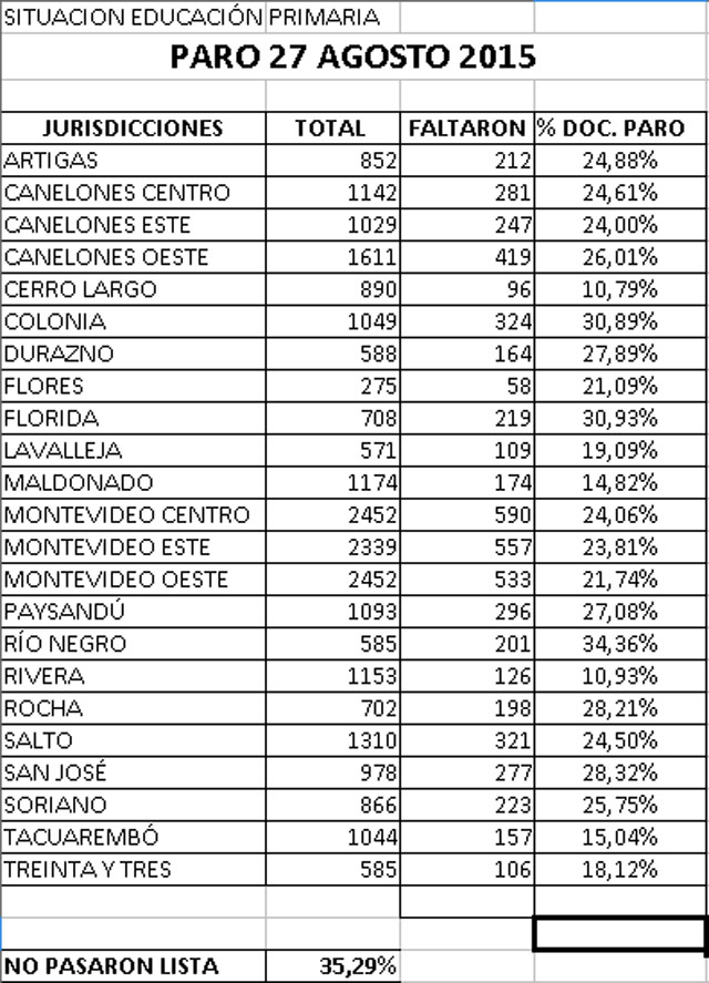 El lunes 24 faltaron 2.481 maestros, de los 25.868 que debían asistir a clase. La inasistencia alcanzó al 9,5%. Ese día solo hubo paro del sindicato de maestros en Montevideo.