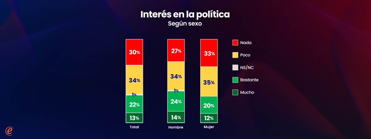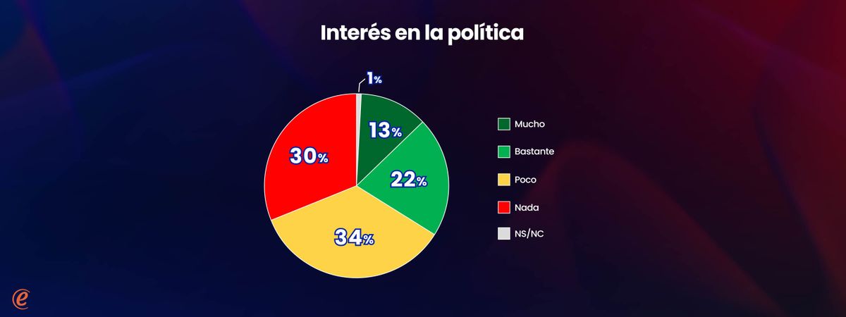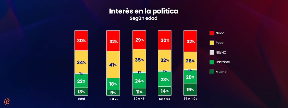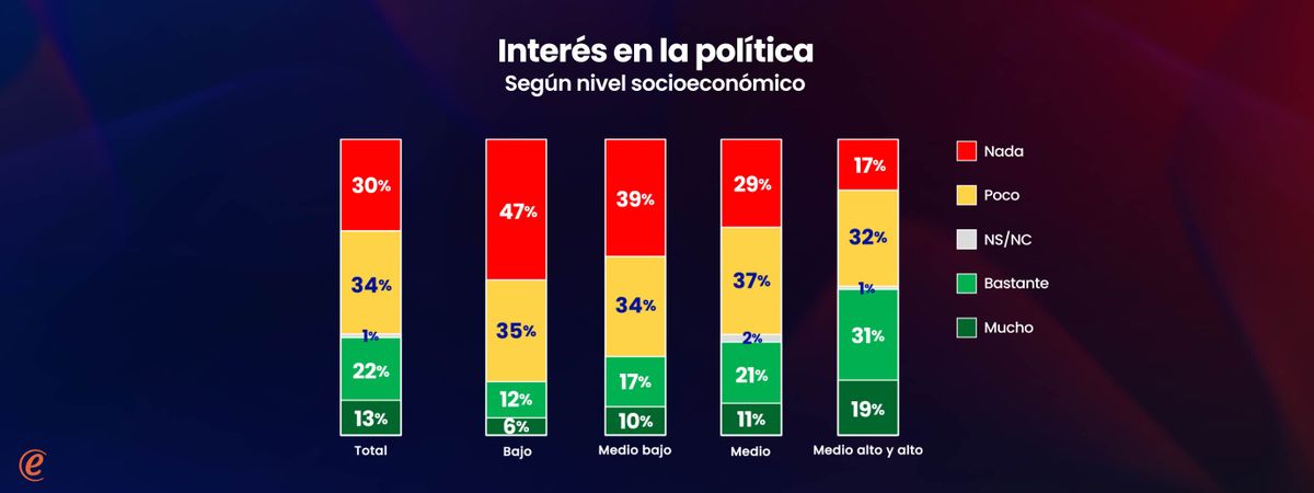 La política interesa más a medida que aumenta la edad y está notoriamente asociada al nivel socioeconómico de las personas. Entre los más jóvenes y las personas de nivel socioeconómico más bajo, el interés es bastante menor que en el conjunto de la población.
