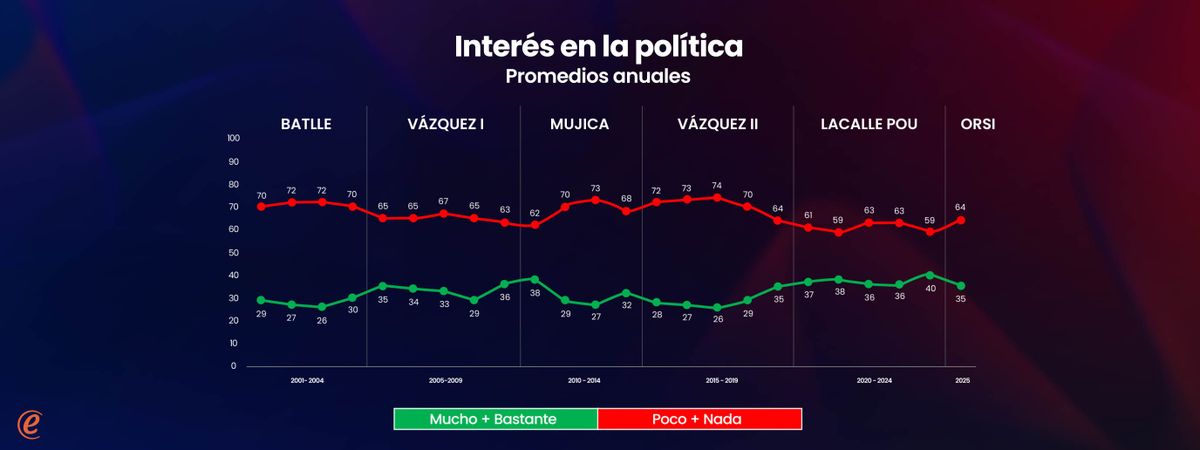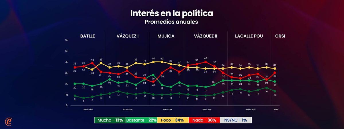 En el corto plazo, efectivamente durante 2025, el interés en la política cayó comparado con 2024 y también con los años previos. Pero es necesario tener en cuenta que este último período fue uno de interés excepcionalmente alto respecto al pasado. A partir de 2020 la pandemia de Covid-19 generó un contexto en el cual la política resultó más atractiva para muchos ciudadanos. Y 2024 particularmente, año electoral con plebiscito de la seguridad social incluido, fue el año de mayor interés de todo el registro histórico del siglo (con 40% de interés “mucho” + “bastante”). Por tanto, caída efectiva respecto a los años anteriores sí, pero con la advertencia de que se venía de años muy buenos.