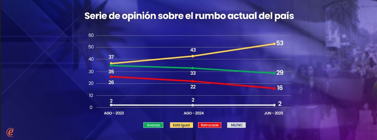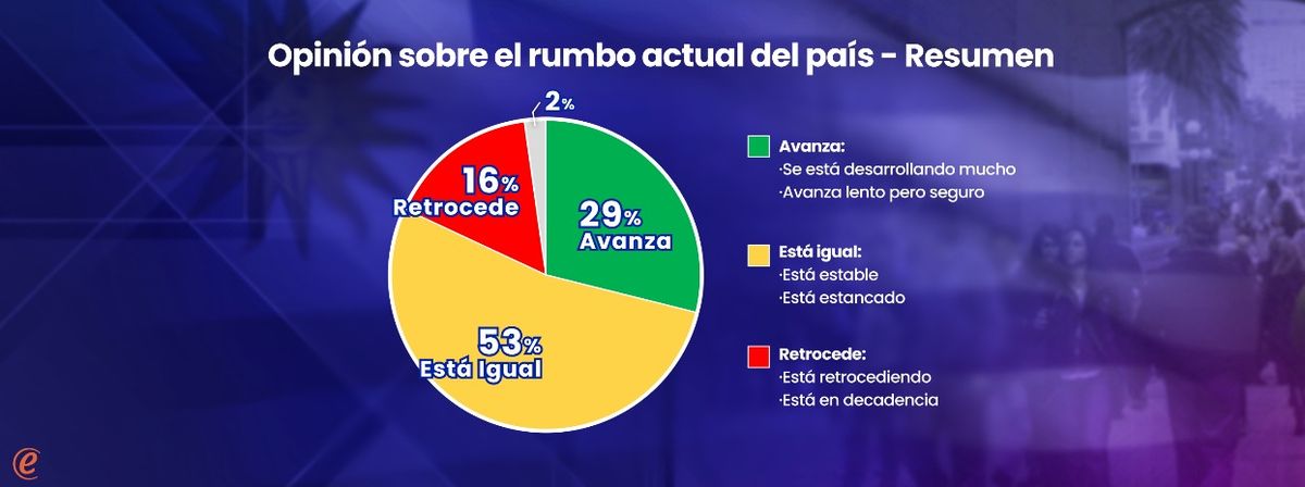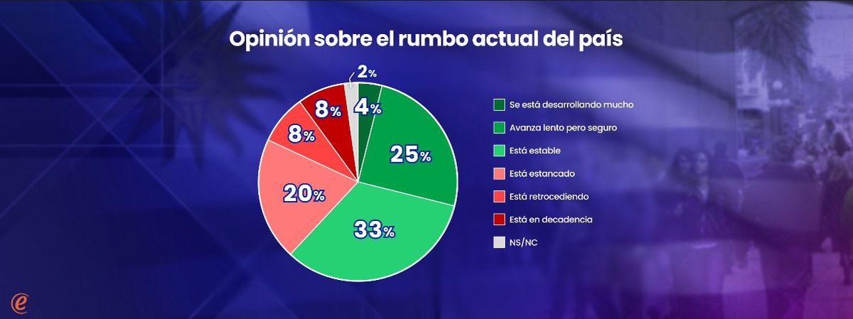 Muy pocos uruguayos tienen posiciones extremadamente positivas o negativas sobre cómo le está yendo al país. Predominan, más bien, las posiciones intermedias: más de la mitad de la población (53%) se concentra en la idea de que el país está “estable” o “estancado” (dos categorías que sugieren inmovilidad, aunque a su vez con sentido distinto entre ellas). Los que tienen visiones netamente positivas (29%) superan a los que tienen juicios definidamente negativos (19%). Los datos corresponden a la última encuesta de Equipos Consultores.