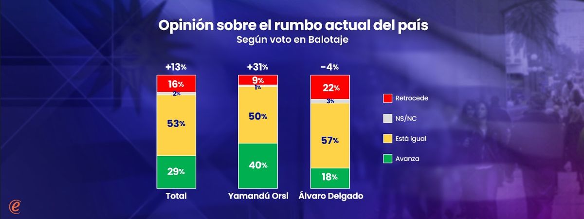 Los votantes de Yamandú Orsi de la segunda vuelta tienen visiones más positivas sobre la situación actual del país que quienes votaron a Álvaro Delgado. Pero dos apuntes. En primer lugar, que en ambos segmentos las categorías intermedias son las más mencionadas. Esto significa que ni la visión de los frenteamplistas es tan positiva, ni la visión de los votantes de la oposición es tan negativa sobre la marcha del país.