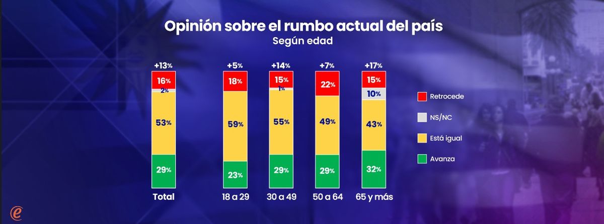 Las diferencias por edad no son tan significativas, pero existen, particularmente vinculadas a las visiones positivas. A medida que aumenta la edad, mayor es la creencia de que el país avanza, mientras que a medida que la edad disminuye, se engrosan las categorías intermedias.