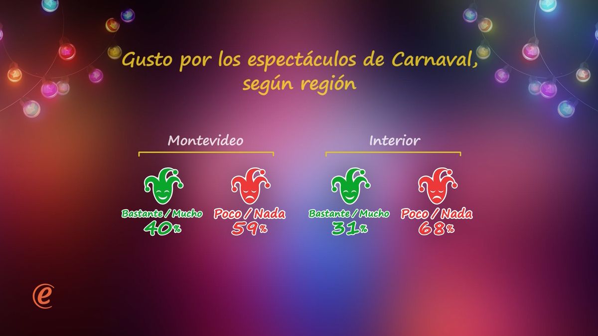 Como cualquier otra expresión cultural, el Carnaval no concita unanimidades. Y el gusto por los espectáculos de Carnaval no se distribuye homogéneamente en la sociedad. En términos generales, el Carnaval es más montevideano que del interior del país (40% contra 31%). Es posible que en algunas localidades específicas del interior el atractivo por el Carnaval también sea alto, pero en esta encuesta no es posible desglosar la información por departamento o localidad. Por otra parte, resulta curioso que, siendo el Carnaval más atractivo en general para los montevideanos, también es donde es mayor el grupo de quienes más lejanos se sienten: quienes no gustan “nada” del carnaval son 32% en la capital del país y 21% en el interior. Entre los montevideanos el Carnaval genera opiniones más extremas que en el interior del país (a favor y en contra).