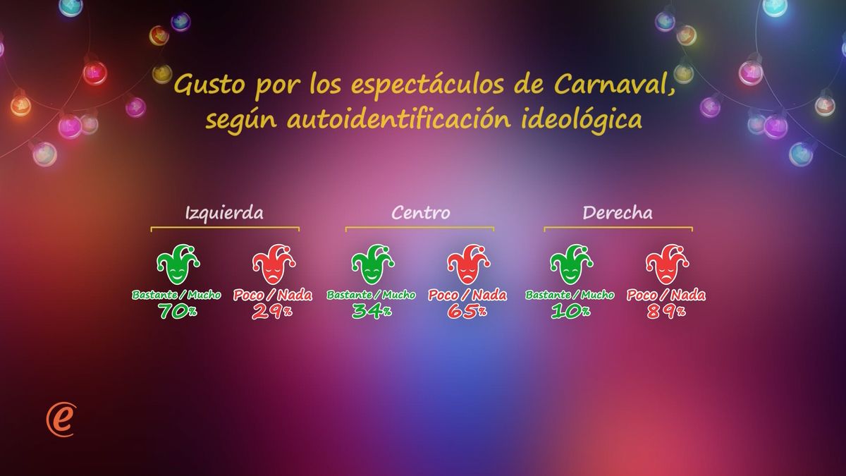 Finalmente, hay una asociación fuerte entre el gusto por el Carnaval y las orientaciones ideológicas de las personas. Entre quienes se identifican con la izquierda la preferencia por el Carnaval es fuertemente predominante (a 42% le gusta “mucho” y a 28% “bastante”), y entre quienes se identifican con la derecha ocurre lo contrario. Apenas uno de cada diez ciudadanos identificados con la derecha manifiesta gusto por los espectáculos de Carnaval.