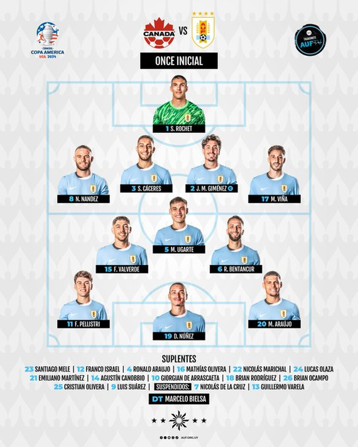 De esta forma, Rochet fue al arco, con una línea de cuatro en el fondo conformada por Nández (volvió tras la suspensión por roja), Gíménez (capitán), Cáceres y Viña (volvió tras la baja por lesión).