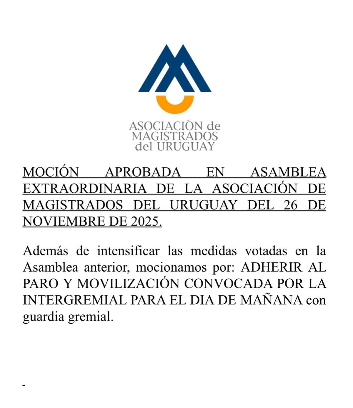 "Moción aprobada en asamblea extraordinaria de la Asociación de Magistrados del Uruguay del 26 de noviembre de 2025: Además de intensificar las medidas en la asamblea anterior, mocionamos por: adherir al paro y movilización convocada por la intergremial para el día de mañana con guardia gremial".